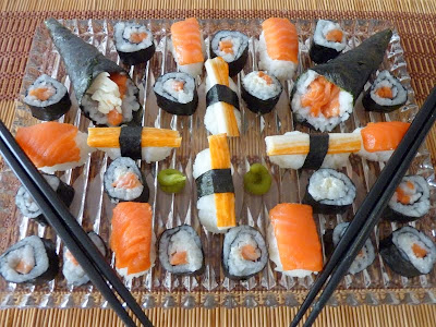Numa tarde de sábado de 2009, me aventurei na culinária japonesa. Comprei os ingredientes na véspera (tem um mercadinho asiático aqui perto de casa, encontrei todos os ingredientes lá), assisti os vídeos com aulas do sushiman paulista Roberto Moriya e mandei brasa! Foi simples assim. Os vídeos sao ótimos, ele cita os ingredientes detalhadamente, ensina o passo-a-passo e dá dicas. O resultado foi ótimo, nao ficaram lindos mas ficaram gostosos... eu e o maridao devoramos tudo em minutos. O que NAO foi fácil foi lidar com o cheiro de peixe impregnado no apartamento durante 3 dias... ehehehe