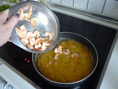- Aqueça o azeite de oliva numa frigideira grande e refogue o tempero batido. Depois de 10 minutos acrescente o camarão, o leite de coco, o tomate, a cebola e o pimentao restante cortado em rodelas, refogue por mais 5 minutos agora com a panela tampada.