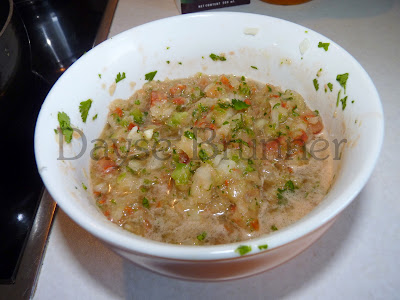 - Enquanto isso, bata no mixer ou liquidificador: sal e pimenta a gosto, 02 dentes de alho, 1 tomate, 1 cebola, coentro, cebolinha, suco de meio limao e metade do pimentao. Bata ate virar uma pasta cremosa. Reserve.